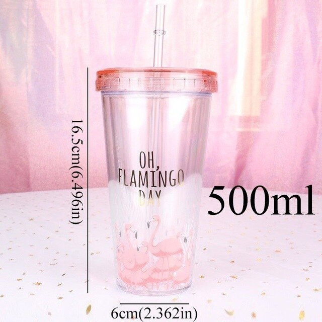 500ml Flamingo Plastic travel Tea Coffee mug straw Cup tubule with lid Cute Cartoon Drinking Double Wall for Milk Juice Water
